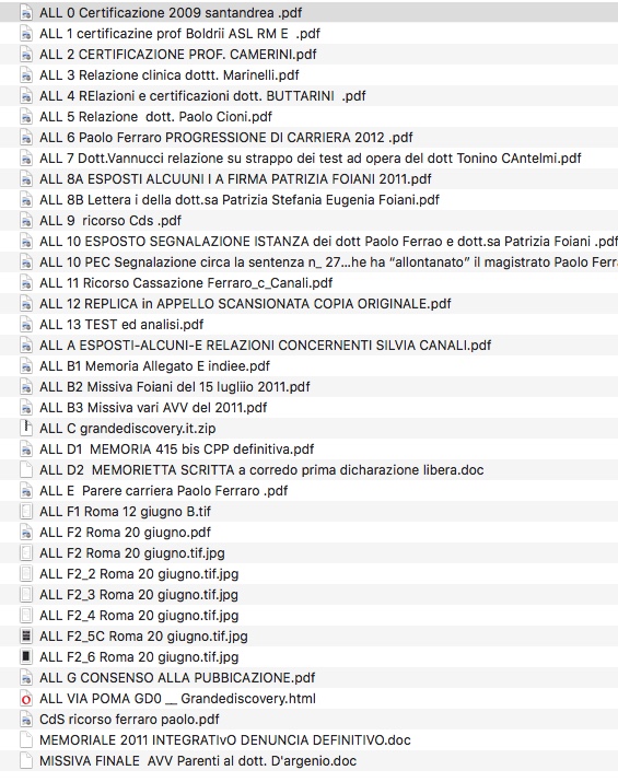 Le allego a tal proposito, per non tediarLa un indice riferito ad un solo blocco di atti e solo qualche esemplare della documentazione a dir poco chiarissima di provenienza di un piccolo stuolo di professionisti e dalla dott.ssaPatrizia Stefania Eugenia Foianii anche da LEI pretermessa INTEGRALMENTE - e sottolineo la gravità del fatto confrontato con la eventuale acquisizione di artate documentazioni/dichiarazioni di parte terza- (ALLti B) a tutela del magistrato Paolo Ferraro, aggredito quando emersero pubblicamente prove sui veri fatti che concernono la grandediscovery 1 2 e 3.